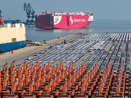 2月10日,装载着出口汽车的双燃料汽车运输船“海洋传统”轮从山东港口烟台港起航。(新华社发)