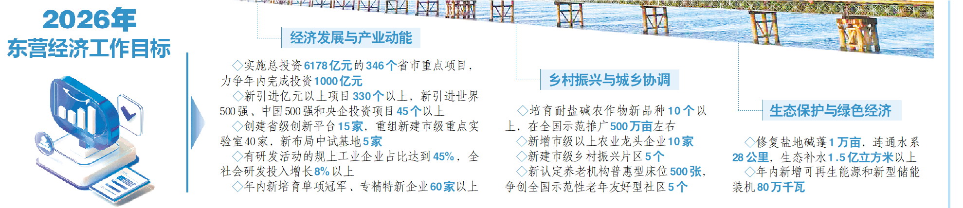 2026年,东营将加快完善养老托育服务体系,发展社区支持的居家养老,新认定养老机构普惠型床位500张,争创全国示范性老年友好型社区5个,让“老有所养、老有颐养”更加触手可及。同时,新建市级乡村振兴片区5个,积极创建省级片区,统筹改善农村人居环境、基础设施和公共服务,促进农民物质富裕与精神富足协同共进。